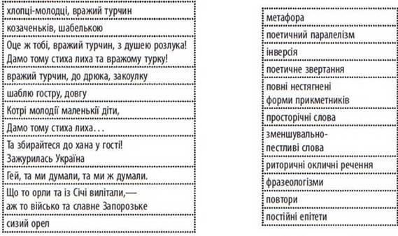 Поєднайте назви художніх засобів із прикладами, зробіть висновки про найпоширеніші художні засоби в усній народній творчості, зокрема історичних піснях.