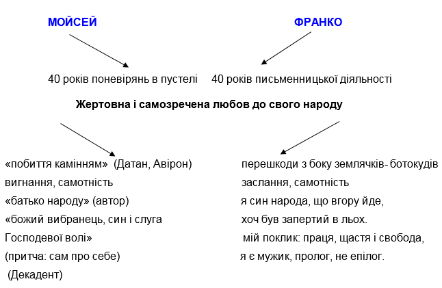 Перш за все це його 40-річна письменницька діяльність. Він був для свого народу своєрідним проводирем, пророком, бо вказував шляхи до його визволення і свободи. Дмитро Павличко цілком правильно оцінив діяльність Франка, сказавши, що «Шевченко народив, а Франко виховав українську націю». І це глибоко символічно. Поет був духовним та інтелектуальним лідером Галичини, її серцем та мозком, зазнав тяжких випробувань долі, нерозуміння багатьох амбітних сучасників, їх заздрість, а то й ненависть. Тобто, образ Мойсея був йому духовно близьким. Через нього митець виповів і свої переживання та сумніви, змалював увесь драматизм становища пророка, який волею Бога має глибше, ніж інші, бачення та розуміння життя, але не отримує повної підтримки народу, заради якого несе свій подвижницький хрест.