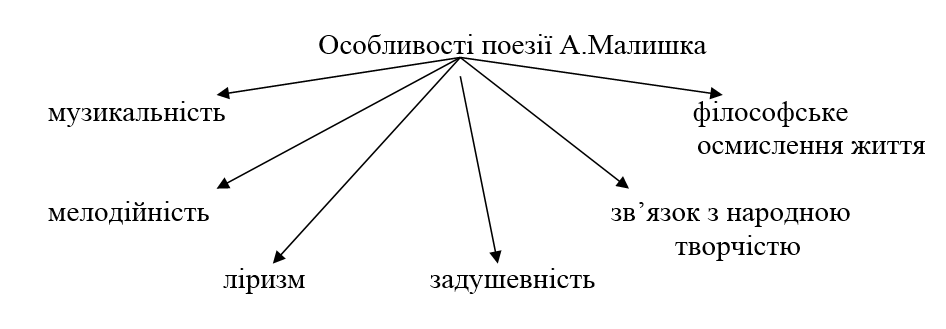 - Складання опорної схеми про особливості поезії А.Малишка.
