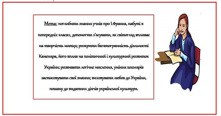 Мета: поглибити знання учнів про І. Франка, набуті в попередніх класах, допомогти з’ясувати, як світогляд впливає на творчість митця; розкрити багатогранність діяльності Каменяра, його вплив на політичний і культурний розвиток України; розвивати логічне мислення, уміння школярів застосовувати свої знання; виховувати любов до України, пошану до видатних діячів української культури.