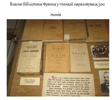 Як селянина, його посадили в кутку за «ослячу лаву». Та незабаром виявилося, що цей «хлоп» є найздібнішим учнем гімназії. «Шкільна наука ніколи не була для мене страшною, - згадував Франко,-а навпаки, все доставляла мені нові приємності в міру того як розширювався обсяг нового знання». Пояснити успіхи в навчанні одними здібностями було б неправильно. Основним було пристрасне, всепоглинаюче бажання вчитися. Франко багато читає, збирає власну бібліотеку (у гімназії його книгозбірня нараховувала 500 томів, у Львові — 6 тисяч).