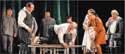 Сцена зі спектаклю «Хазяїн» Національного академічного драматичного театру ім. І. Франка. 2014 р. У ролі Пузиря (у центрі) — П. Панчук