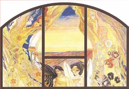 Панно поділено на чотири частини темними смугами, що асоціюються з віконною рамою. У центральній частині композиції зображено юнака із чорними крилами, який грає на сопілці, й тендітну дівчину з білими крилами. Образ юнака — чорного янгола — написано з молодого Павла Тичини, а дівчини — білого янгола — з Поліни Коновал. Їхні фігури змальовано в буянні різних квітів. Постать юнака увиразнюється квітами теплих (жовтогарячих) тонів — це соняшники, чорнобривці, гвоздики. Обіч дівчини домінують квіти холодних (білий, темно-фіолетовий, бузковий) кольорів — татарська гвоздика, чорна фіалка, синюха Лазарева.