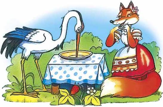 Іде Журавель на прошений обід, а Лисичка наварила кашки з молочком, розмазала тоненько по тарілці та й поставила перед Журавлем.