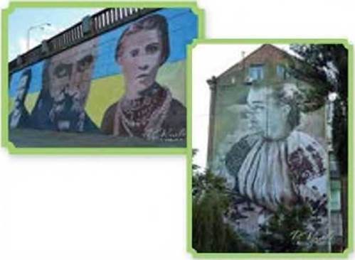 Розгляньте два графіті1. Чи схвалюєте ви, коли паркани та стіни розмальовують таким чином? Чи варто зображувати на стінах портрети відомих українських письменників? Чи не оскверняють автори графіті в такий спосіб пам'ять національних геніїв? Доведіть свою думку.
