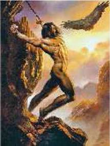 Прометей у давньогрецькій міфології — титан, покровитель і захисник людей, який викрав вогонь з Олімпу й віддав людям. За це Зевс жорстоко покарав його: наказав прикувати до скелі в Кавказьких горах. Щодня орел клював у нього печінку, яка за ніч виростала знову.