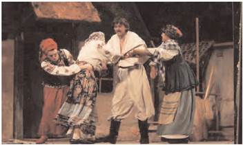 Сцена з вистави «Кайдашева сім’я» у виконанні акторів Черкаського музично-драматичного театру. Режисер А. Куниця. 2014 р.